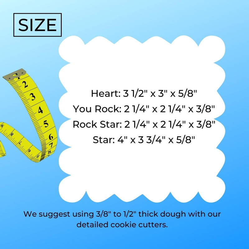 - SIZE - Heart: 3 1/2" x 3" x 5/8" You Rock Stamp: 2 1/4" x 2 1/4" x 3/8" Rock Star Stamp: 2 1/4" x 2 1/4" x 3/8" Star: 4" x 3 3/4" x 5/8"