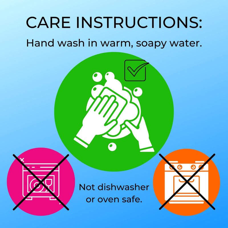 - CARE INSTRUCTIONS - Hand wash only in warm, soapy water. Not dishwasher or oven safe