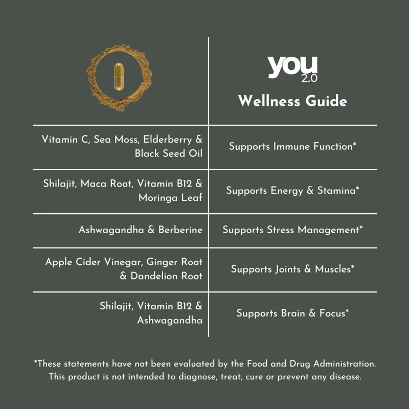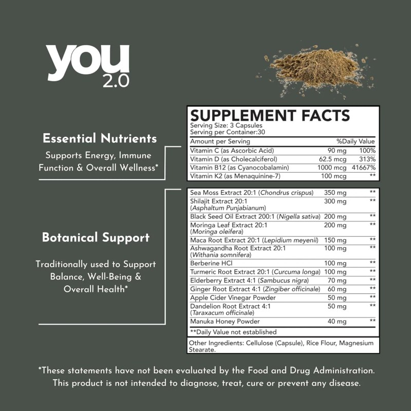 • All-in-One Powerful Supplement – You2.0 Advanced Sea Moss Capsules for men and women include 16+ natural ingredients like Shilajit, Ashwagandha, Maca Root, Moringa, Bladderwrack, Ginger, Black Seed, and Turmeric Curcumin. Designed to support energy, immune function, joints, and thyroid health—for all-Day Night wellness.