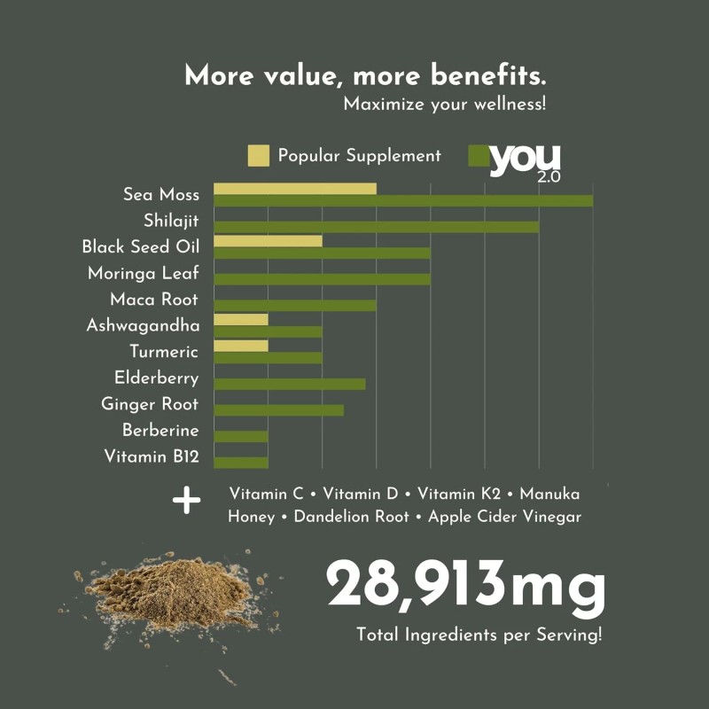 You2.0 Powerhouse Superfood with Seamoss, Shilajit, Ashwagandha, Berberine, Maca, Black Seed Oil, Turmeric, Vitamin C, D, B12, K2 - Moringa, Apple Cider, Made in USA for Overall Health & Immunity