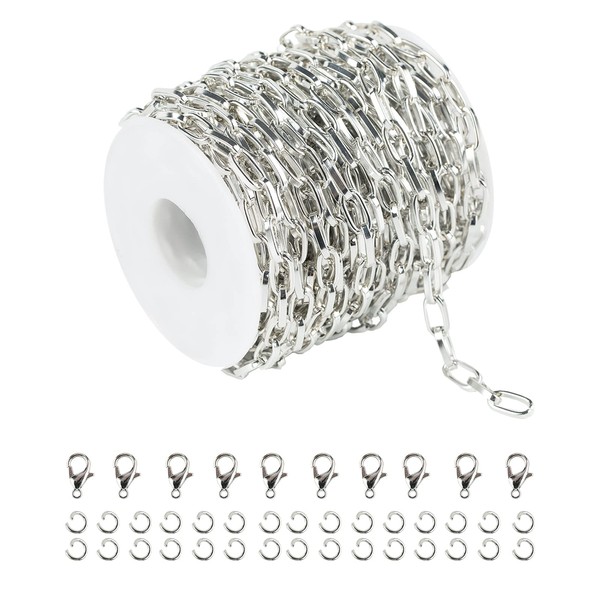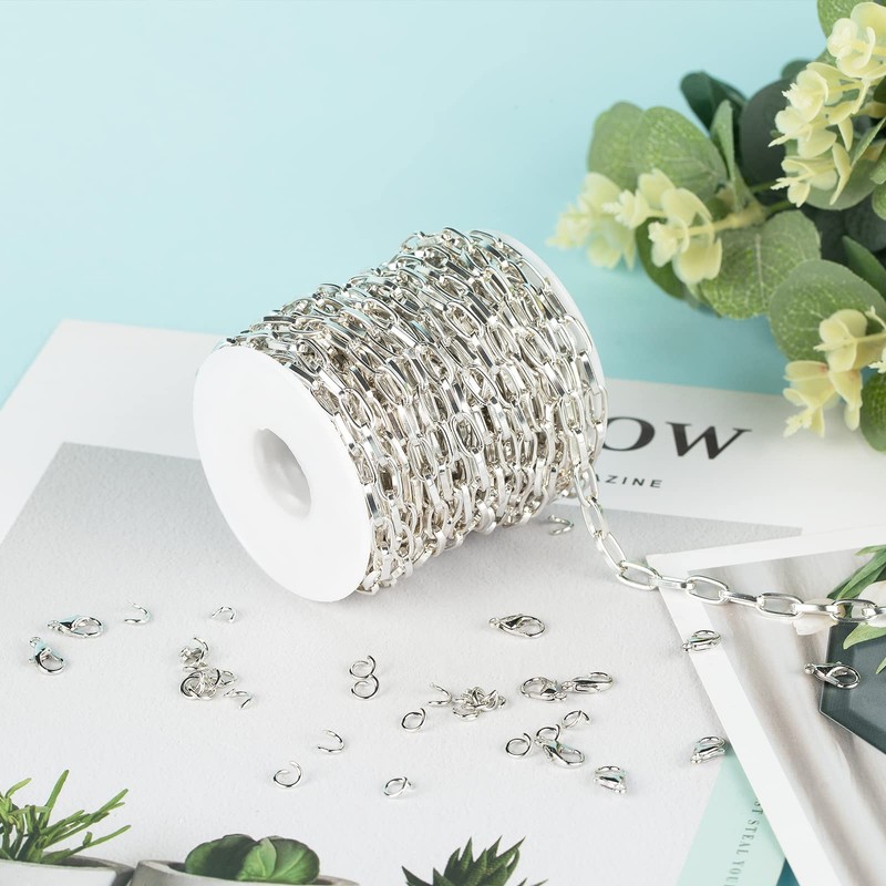 - What you get: The package includes a roll of 10 m/32.8 feet unwelded silver aluminum flat oval paperclip chains, 10pcs lobster clasps and 30pcs jump rings; with this jewelry chain kit you can make many beautiful crafts and jewelry projects.