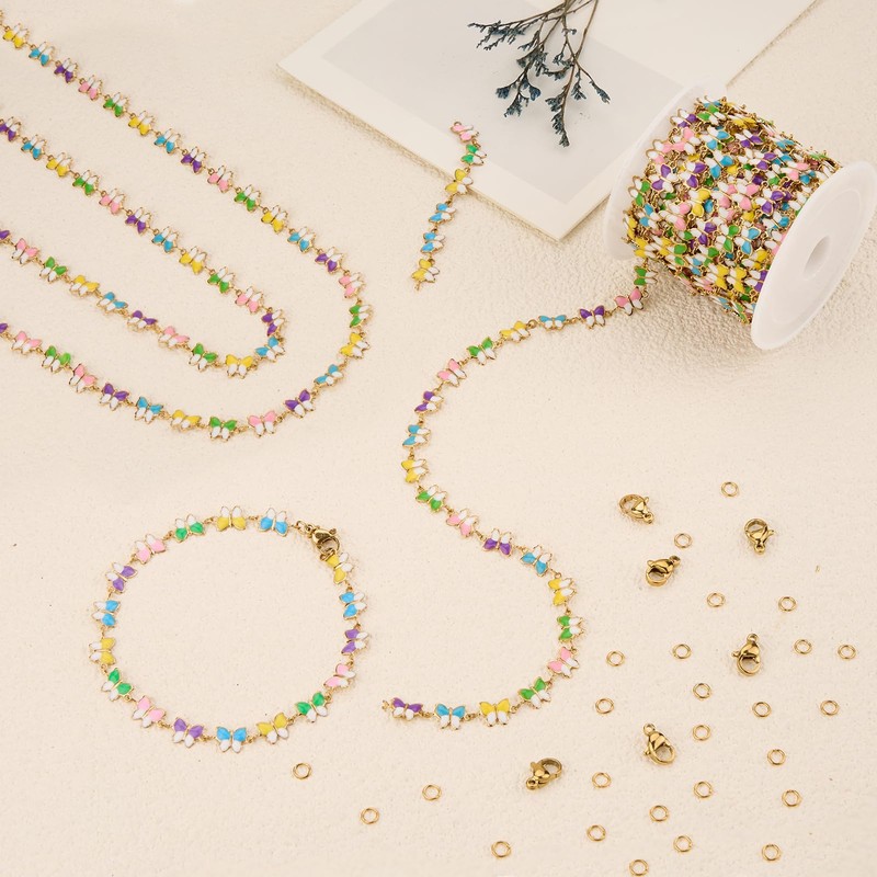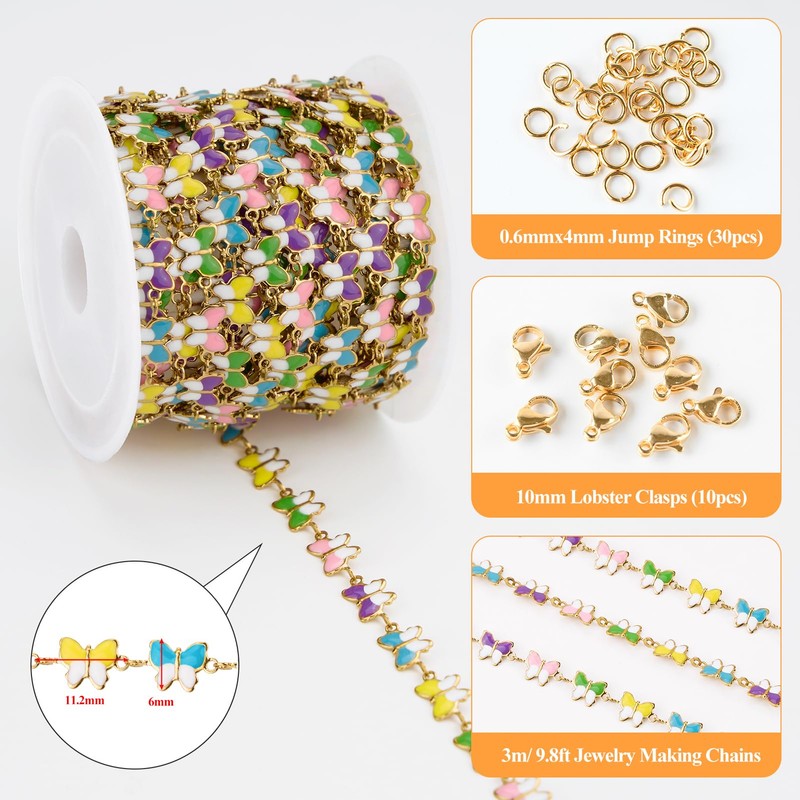 - Jewelry Chain Set- Each package includes 3 meters colorful enamel butterfly chains for jewelry making on a spool, come with 10pcs lobster clasps and 30pcs jump rings. Easy to diy various jewelry projects with these quality jewelry supplies findings.