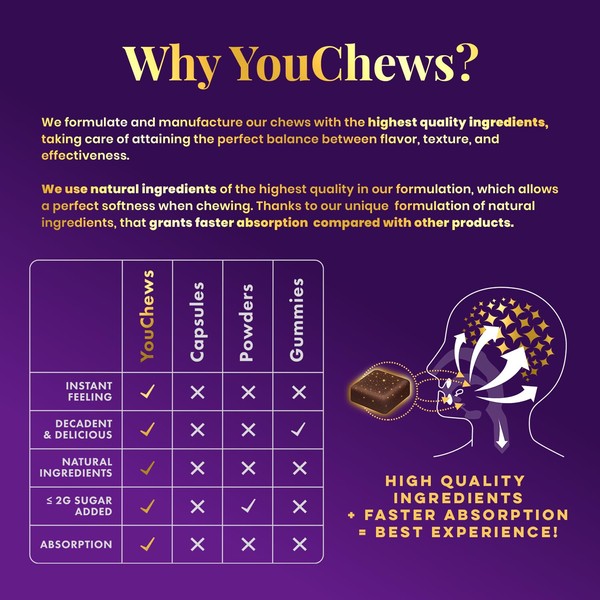 - Improve Cognitive Abilities: YouChews can help reduce fatigue and improve alertness, vigilance, reaction time, and attention, especially during cognitive tasks. Support your mental clarity and endurance with a low sugar, low calorie option