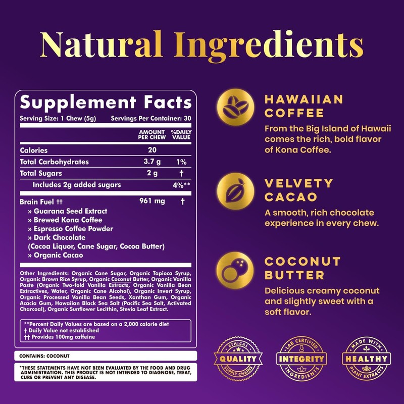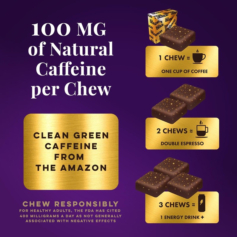 - Natural & Effective Caffeine Sources: Enjoy sustained clean, green energy with caffeine derived from Guarana Seed extract, brewed Kona coffee, and espresso coffee powder. One 5g chew provides the same caffeine kick as a cup of coffee, offering a convenient and quick-absorbing energy source