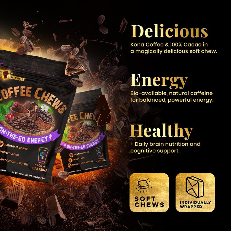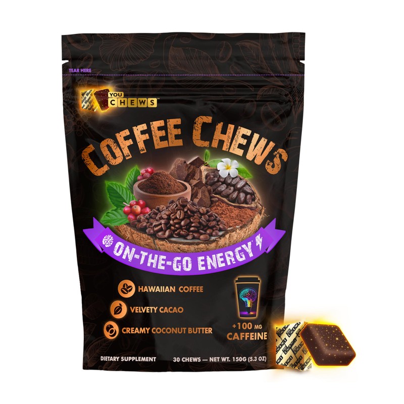 - Delicious Coffee Chews: YouChews are crafted with the bold flavor of Hawaiian Kona Coffee, velvety cacao, and creamy coconut butter. Each vegan chew has a soft texture and contains 100mg of natural caffeine with just 2g of sugar for a quick energy boost