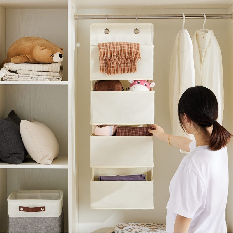 YOUDENOVA Hanging Organiser, Door Organiser, Hanging Storage with 4 Pockets and 2 Metal Hooks, Hanging Shelf, Sturdy Wardrobe Organiser, for Bathroom, Bedroom, Children's Room, Beige