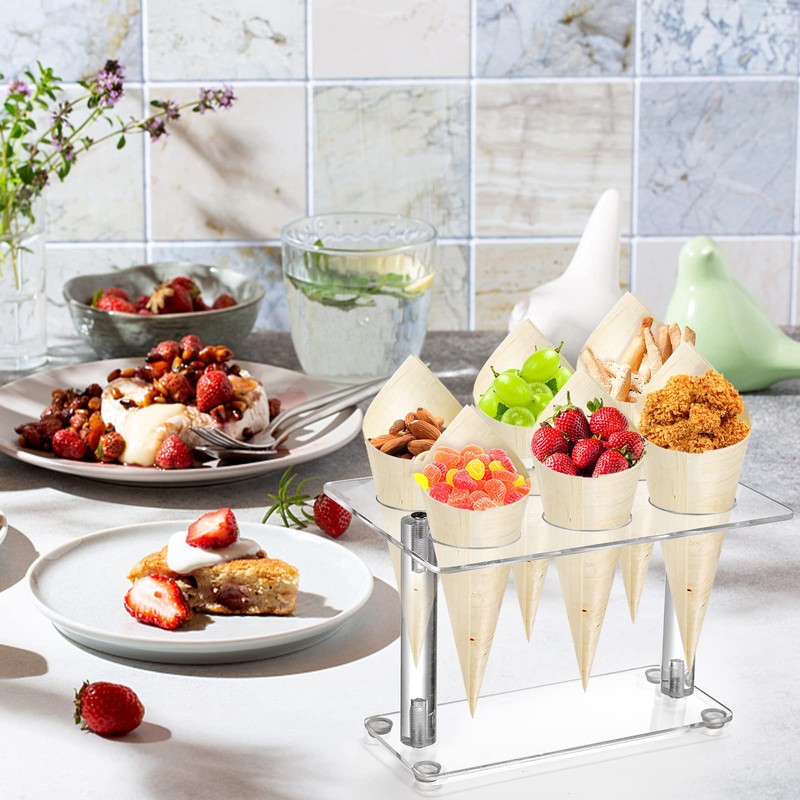 - Dessert Display: Not only can the cone holder be used to display ice cream cones, but also can be used to display candy buffet, popcorn, waffle cones, hand roll sushi, snow cone, snack mix, peanuts, french fries and fruit cones. Plus the smaller bottom plate will not take much room on the table.