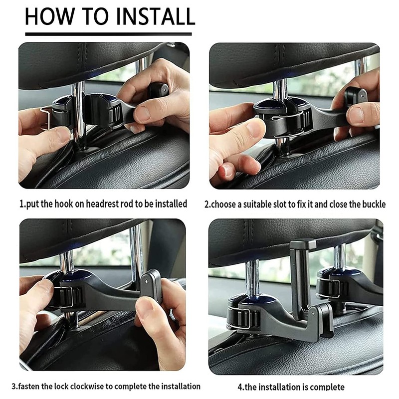 - Easy to install: Simply open the lock, select the appropriate card slot to attach and close the lock to lock it. The hook can be rotated 360° and can be hidden under the headrest bar when not in use.