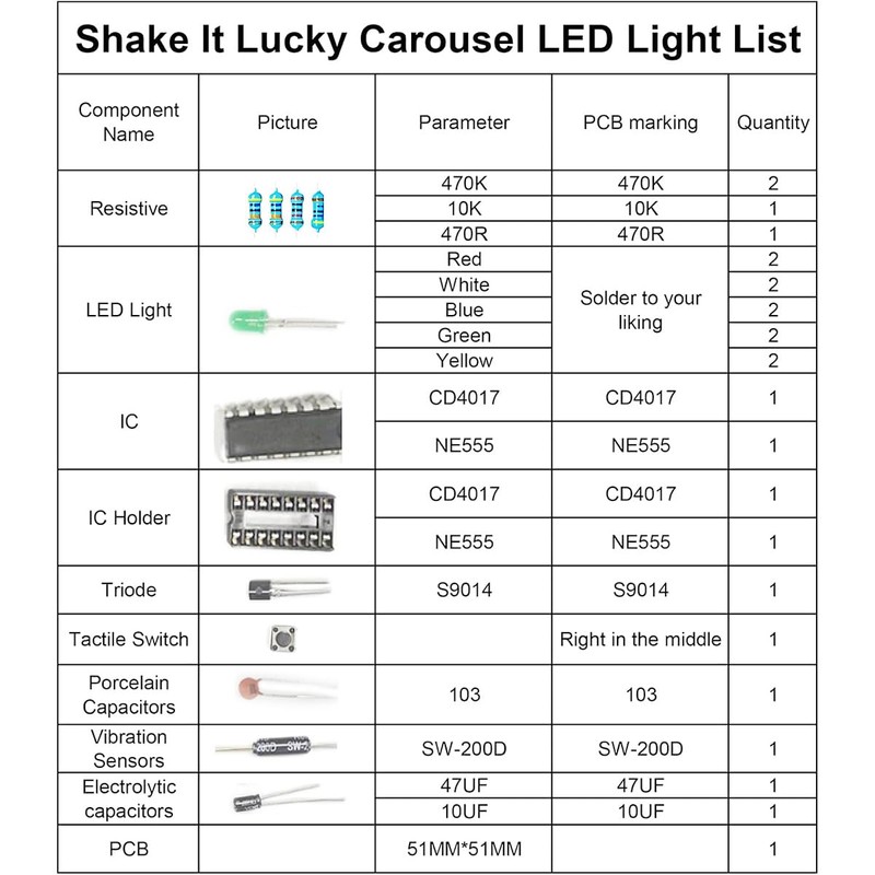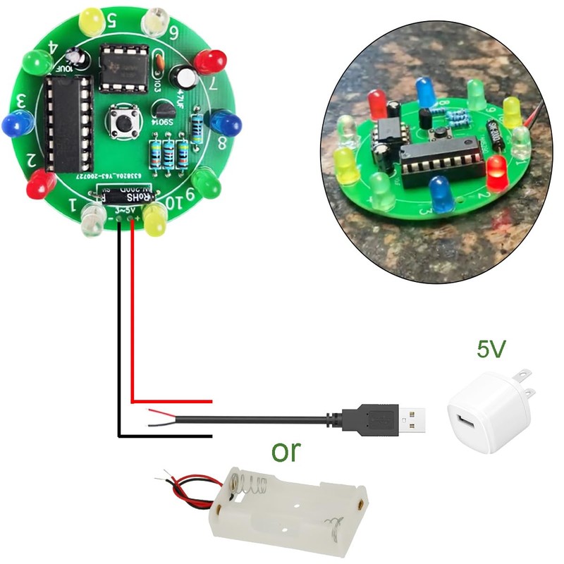 - Specifications: Dimensions: 51*51mm;PCB material: single-sided 1.6mm FR-4 board;Supply voltage: 3V-5V;LED quantity: 10 pcs 5mm LED;LED color: yellow red blue green white