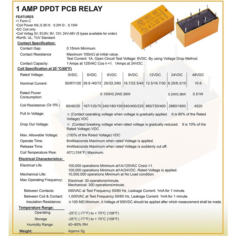 - Voltage: Coil Voltage: DC 5V (12V); Contact Rating: 1A 125VAC / 2A 30VDC; 2NO 2NC