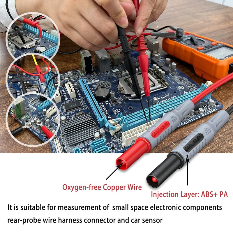 - 【Safe and Efficient】 Multimeter test leads are made of high quality, soft, high grade silicone insulation for flexibility and durability. Silicone helps to extend the service life and can be used in extreme environments. Strong electrical conductivity, low resistance, no signal loss. Lead wire: Cat III 1000V,10A.