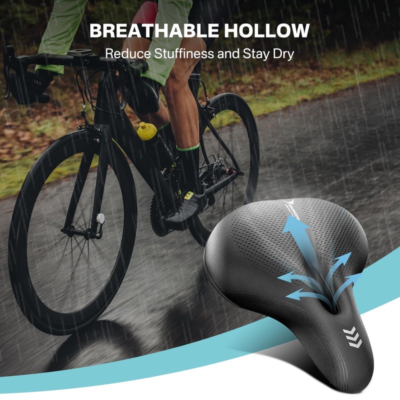 - 🚴【DOUBLE BREATHABLE】: The surface of the bicycle seat features non-slip ventilation holes to increase the ventilation of the saddle. In addition, the hollow structure in the middle of the bike saddle increases air circulation and also reduces pressure on the hips, greatly reducing discomfort caused by sweating and enhancing cycling comfort.