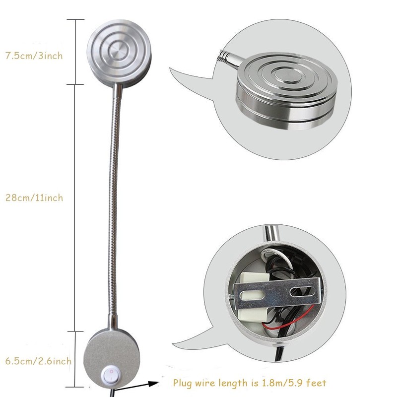 Youngine 5W Plug Wired Flexible Gooseneck Wall Sconce Reading Lamp Art Works Show Accent Light Wall Mount Spot Lamp Fixture with On/off Switch (Round Silver-Warm White)