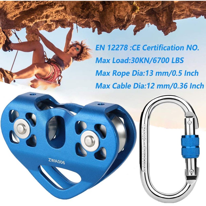 - 【Super Smooth & Large Breaking Strength】- This climbing zipline pulley is mounted on ball bearing, features smooth rotation up to 35 m/s.This tandem pulley is sturdy enough to support up to 30kN (6700lbs),so it can guarantee your safety at most outdoor applications such as climbing, rescue, swing seats or backyard zipline setting etc.