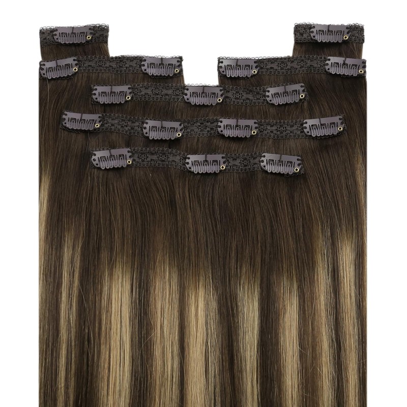 YoungSee Clip in Extensions Echthaar Ombre 45cm Echthaar Extensions Clip Dunkelbraun Balayage Karamellblond Clip in Extensions Kurz Extensions Echthaar Clip in Remy Haare 120g #4/27/4
