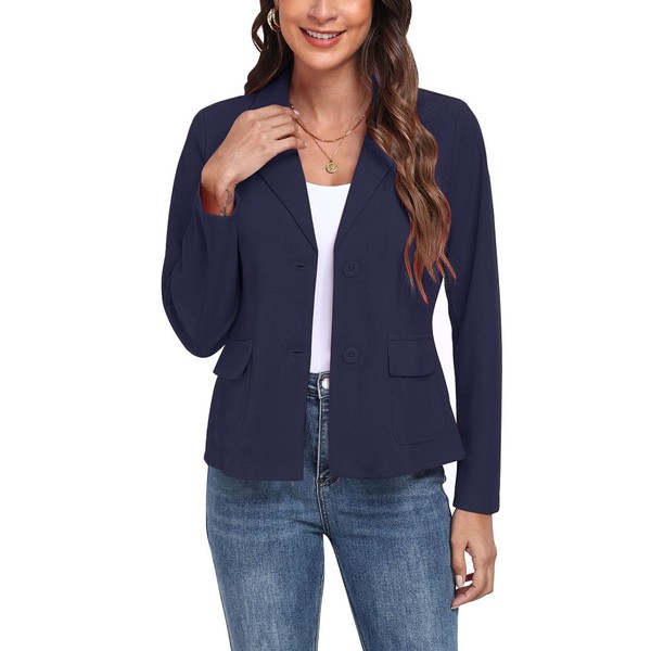 YOUNIFIZ Women's Long Sleeve Blazer Button Front Notched Lapel Jacket Casual Work Office Blazers with Pockets, Navy Blue
