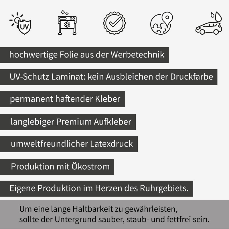 - High-quality materials: the stickers are made of robust, waterproof material that reliably holds both indoors and outdoors. They are durable, so they are also ideal in kitchens, bathrooms or on heavily stressed surfaces. Using UV protective laminate, the stickers are durable, protected from fading, non-yellowing.