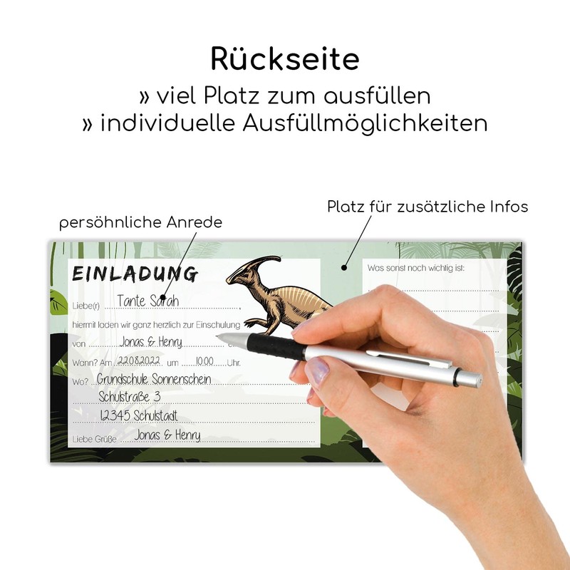 younikat Set of 10 Invitation Cards for Children for School with Dinosaur Motif, DIN Long, 9.8 x 21 cm, with Envelopes and Matching Stickers, PEFC Certified, dv_1115