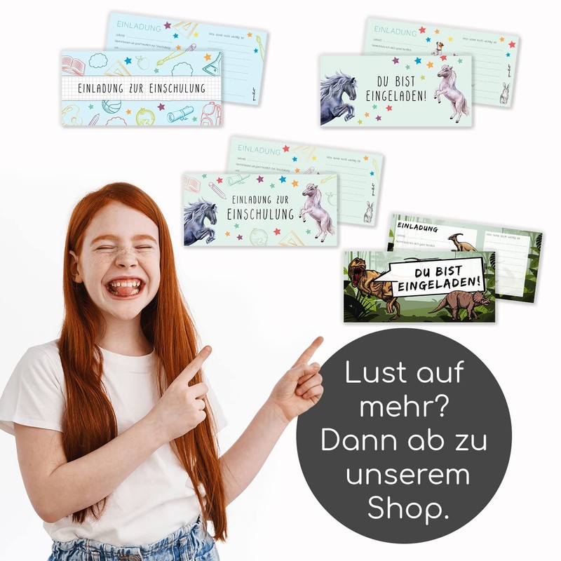 Includes 10 invitation cards, 10 envelopes and 2 sheets of 12 stickers each. The envelopes are DIN long with pointed flap. A sheet of stickers has a saying "schön das du da bist" and a sheet with dinosaur motif. The diameter is approx. 4 cm.