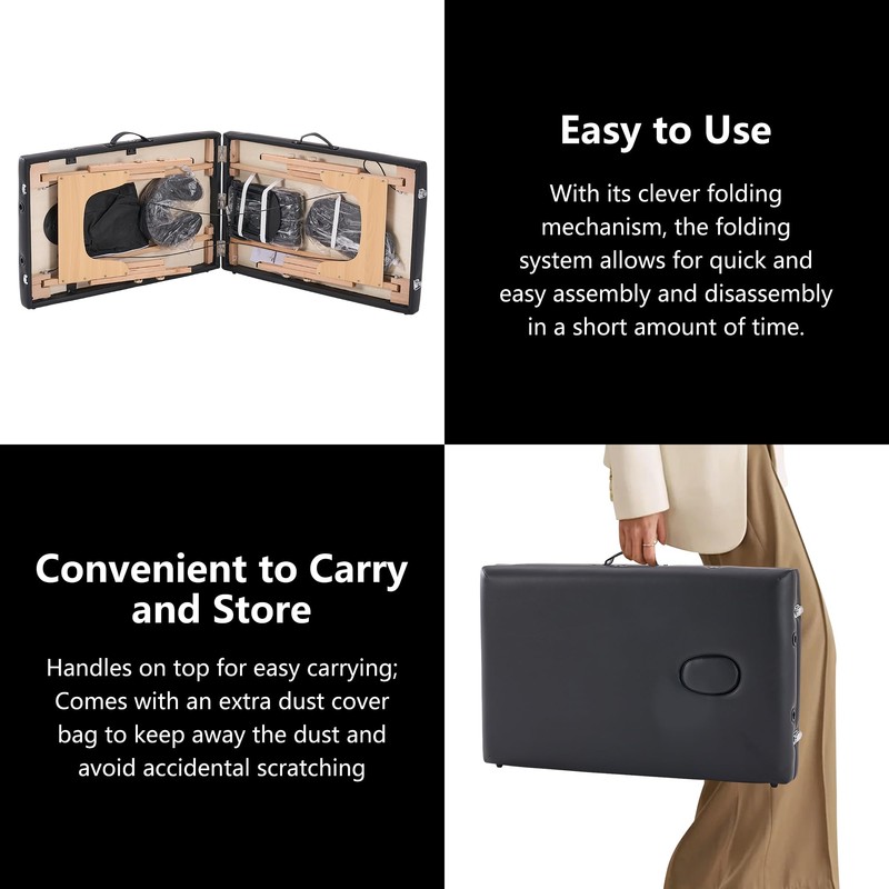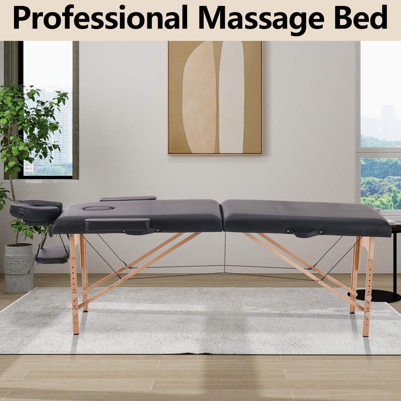 YOUNIKE Portable Foldable Massage Table - Adjustable Height Lightweight Wooden Frame Spa Bed for Tattoo, Facial, Lash, Physical Therapy, Home & Salon Use with Accessories & Non-Woven Bag, Black