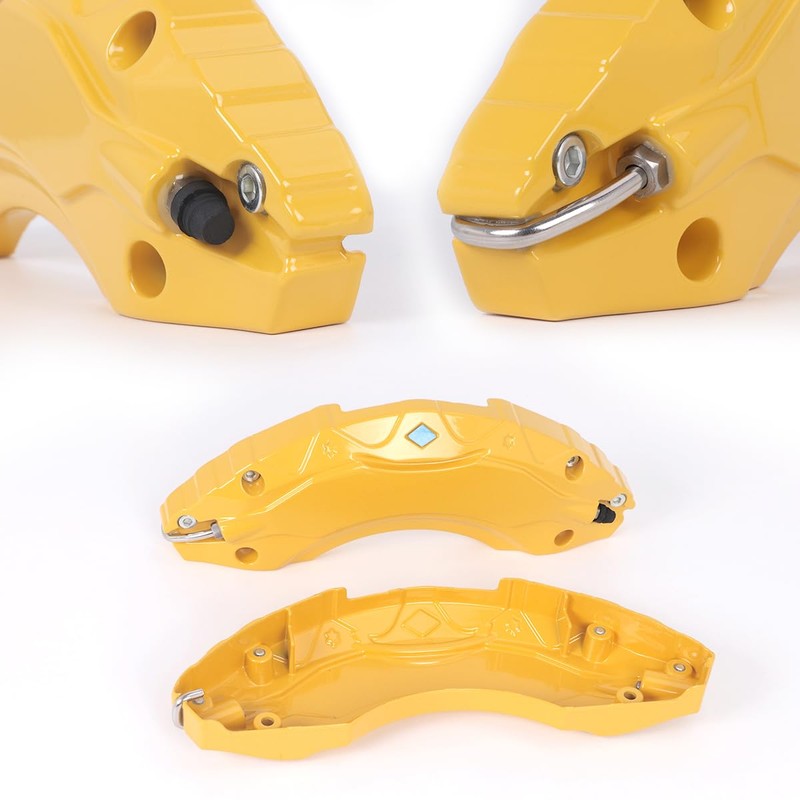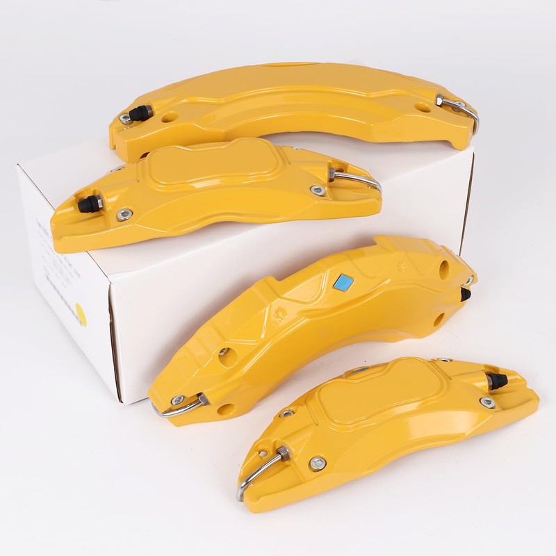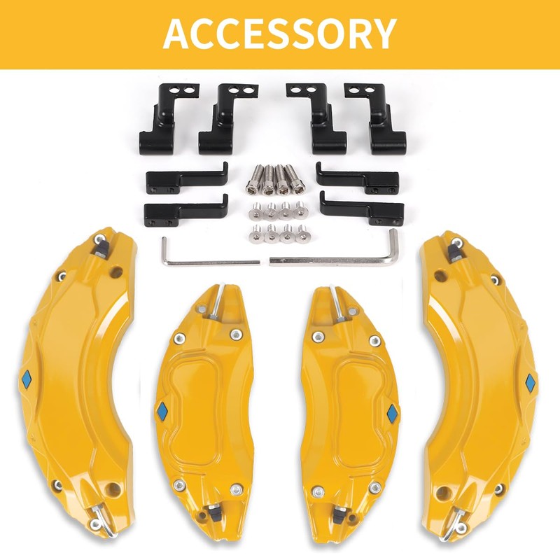 pecifications: Product Name: car caliper covers Material: Aluminum alloy Color: Yellow Package included: 4 x caliper covers 1 bag installation accessories Features: Made of high-quality aluminium alloy material, corrosion resistance and durable, can be used under high temperature. Car brake calliper accessories Set of 4, 2pcs for front wheels and 2pcs for back wheels. Fitment: Please check the model, years and wheel size before pruchasing ! It makes your car trendy and sport with caliper covers.