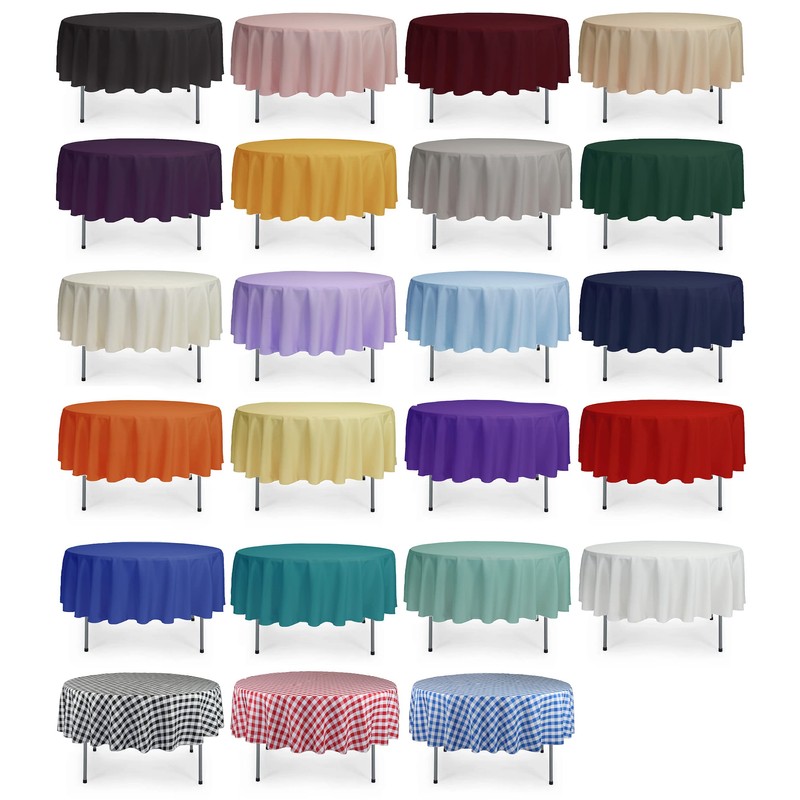 - These round tablecloths are seamless (crafted from a single piece of polyester fabric) and feature serged edges for extra durability