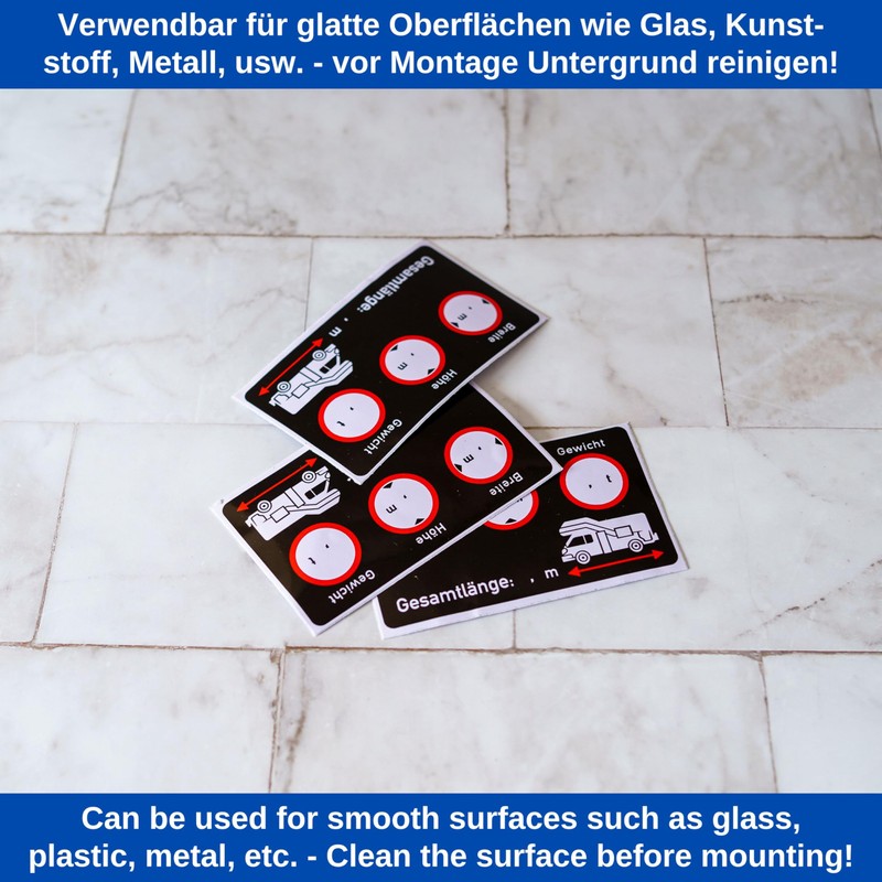 Du hast dir einen Wohnwagen zugelegt und bereitest dich auf den Urlaub vor?Dann ben?tigst du ein passendes Gr??enangaben Sticker Schild mit klar leserlichem Druck!Aufkleber Set fr Wohnwagen Cockpit, 6 Stck, 10 x 6 cm, beschreibbare und selbstklebende Folie, Camper Van Hinweis Klebesticker Fahrzeugma?e L?nge x Breite x H?he x Gewicht, Wohnmobil Zubeh?r StickerDieses "Breite H?he Gewicht Gesamtl?nge" Sticker Set verfgt ber die spezielle Hinweisschild Schrift DIN 1451 und kann auf den meisten glatten Oberfl?chen aufgeklebt werden.Egal ob in Au?enbereich oder Innenbereich, das Hinweisschild fr die wichtigsten Fahrzeug Gr??endetails ist kratzfest, witterungsbest?ndig und UV-best?ndig.Bitte reinige vor Montage des Campervan Cockpit Zubeh?rs den Klebeuntergrund.Der Untergrund muss Schmutz-, Staub-, ?l - und Fett-frei sein, ansonsten kann sich das selbstklebende Fahrzeug Hinweis Schild nach kurzer Zeit abl?sen.Nach dem Anbringen des Aufklebers fr Wohnwagen sollte der Sticker fr vier und zwanzig Stunden nicht direkt in der Sonne sein, damit der Kleber gleichm??ig aush?rten kann.Deine Vorteile auf einen Blick:- Klebesticker fr Fahrzeugma?e aus robusten Komponenten - UV-best?ndig und Witterungsbest?ndig- Vinyl Folie Material zum Beschriften im Direktdruckverfahren hergestellt - Schutz gegen Ausbleichen- L?nge x Breite x H?he x Gewicht Aufkleber fr das Wohnwagen Cockpit aus extra dickem Vinyl Material - h?lt jeden Witterungsverh?ltnissen stand- Wohnmobil Gr??en Zubeh?r zur Montage auf den meisten glatten Oberfl?chen - zum Ankleben- Hinweisschild mit klar leserlicher Schriftart Mittelschrift DIN 1451Im Lieferumfang ist Folgendes enthalten:- 6 Stck bersicht Fahrzeugma?e und Gewicht, zum Ankleben, 10 x 6 cm Format, mit schwarzem Hintergrund, zum Aufkleben in den Innenraum des Campervans