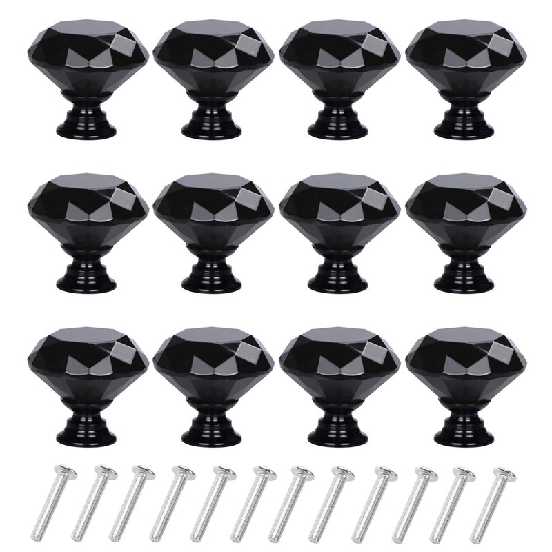 YourGift 12 Pack Drawer Knobs Diamond Shaped Crystal Glass 30mm Cabinet Knobs Pull Handles (30 mm, 12 Pack, All Black)