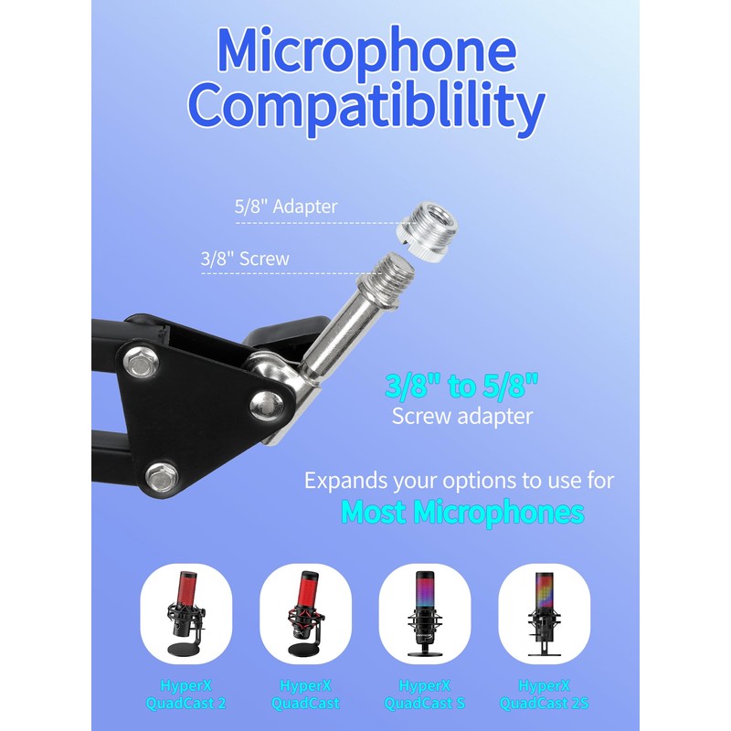 • Universal Professional Microphone Arm Stand - Metal mic boom arm with 3/8" to 5/8" adapter, compatible with most heavy or light microphones and multiple models of microphone shock mounts. Such as: HyperX QuadCast 2, QuadCast 2S, QuadCast, QuadCast S, Blue Yeti, Blue Snowball, HyperX solocast B, Shure MV7, Shure SM7B, Fifine K688, Fifine AM8, Rode, Razer Mini, Gaming Mic and Most Microphones. NOTE: MICROPHONE NOT INCLUDED.