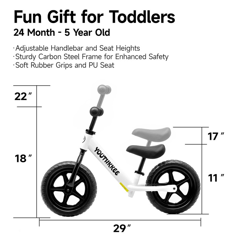 - The Perfect Gift - The Toddler Balance Bike is an ideal birthday gift for kids, combining fun and skill development in one. Watch your child’s face light up as they unwrap their new bike, ready to explore the world on two wheels. It’s a thoughtful and practical gift that encourages outdoor play, physical activity, and unforgettable memories.