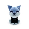 This adorable blue fox sits at 9 inches tall, ready to join your collection. Moxsy is seated comfortably on his bum, with his hind legs spread out and front paws descending forward to keep him balanced. The tip of his tail and the top of his head feature a soft blue color that fades into a light white-blue, adding to his charming appearance. He sports a black hoodie with the words "Damage-Nation" across his chest, capturing his cool and confident vibe. This plush is packed to the seams with 100% PP cotton and made from a mix of the softest minky and sublimated minky materials, making it perfect for cuddling or planning new Borderlands builds with.