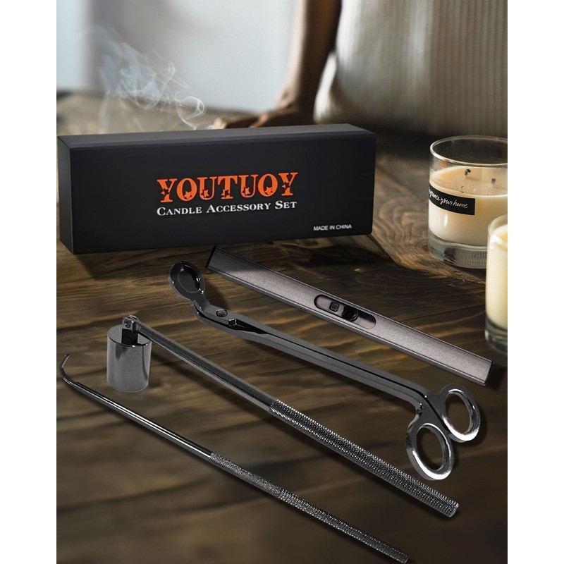 YOUTUOY 4 in1 Candle Accessory Set with Rechargeable Candle Lighter, Candle Wick Trimmer, Candle Wick Snuffer, Candle Wick Dipper, Candle Care Kit (Silver Black)