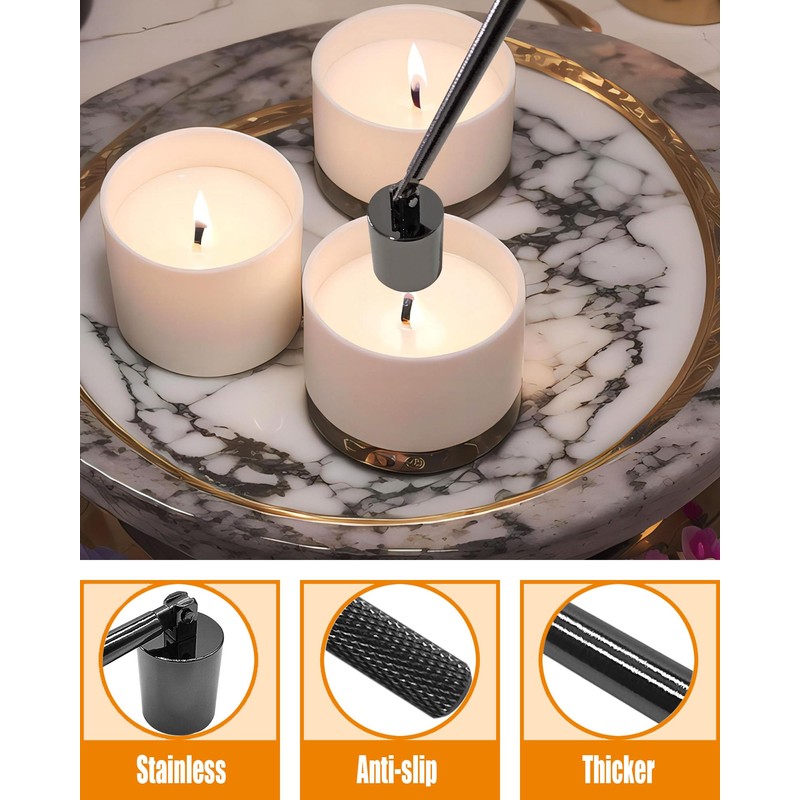 - Candle wick snuffer: Cover the burning wick for 15-25 seconds to extinguish the candle. The candle burns out with producing the pungent smell and dark smoke, use the candle snuffer to dissipate the pungent smell and dark smoke.