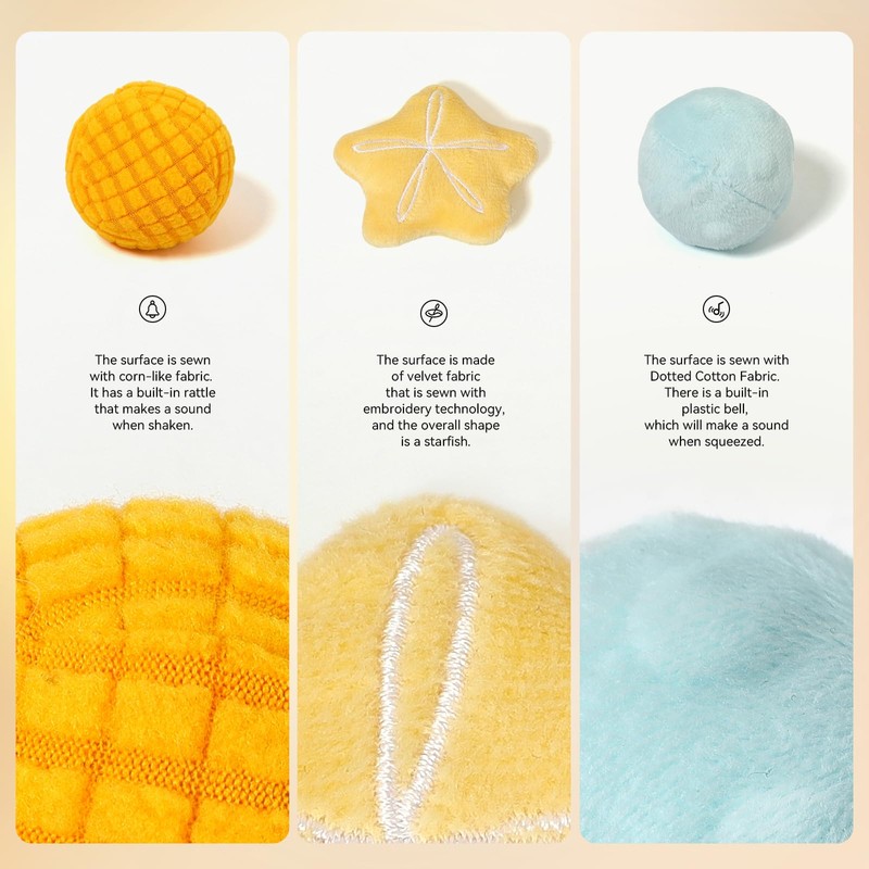 - UNIQUE WAYS TO PLAY: We have arranged different ways to play or fabric materials on the four sides of this toy. The baby can see his appearance through the mirror. The mermaid's tail makes a sound when it is grasped. The shell is made of a piece of paper that makes a sound. The cotton starfish can hide in the "pocket" of the sea. These games enrich the baby's thinking ability, auditory development and perception of different materials