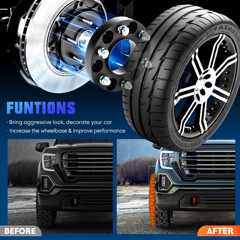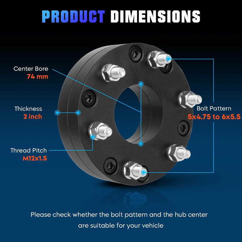 - Specifications: Bolt Pattern: 5x4.75 to 6x5.5 | Thread Pitch: 12x1.5 | Thickness: 2'' | Centre Bore: 74mm | Quantity: 2 PCS Wheel Spacers.