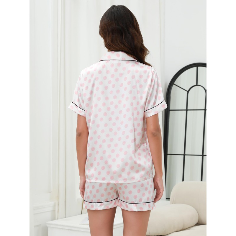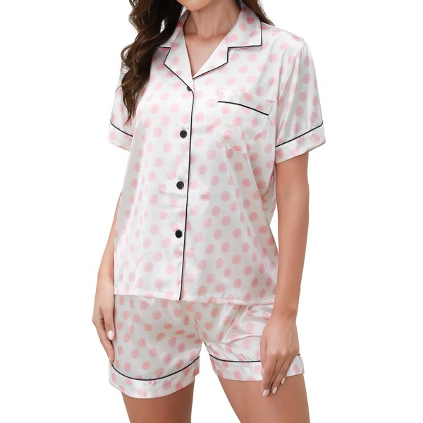 Yowmina Womens Satin Pajamas Set Shorts Sleeve Button Down Top and Shorts Sleepwear 2 Piece Silk Pjs Notch Collar Loungewear(White Pink Polka Dots_L)