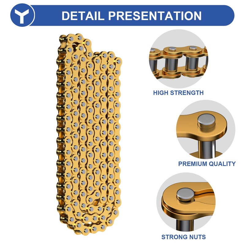- Package List: 1 * 90 links mini bike chain gold, 1 * 42 links mini bike chain gold, 1 * 420 chain breaker, 2 * chain tensioner adjusters, 4 * 420 master link