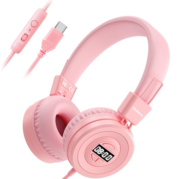 yoygerty USB C Kids Headphones with Alarm, 85/94dB Volume Limit Portable Headphones with Digital Timer, HD Stereo Sound, Over-Ear Headset with Microphone for Kids/Toddlers/Children/Teens/Boys/Girls