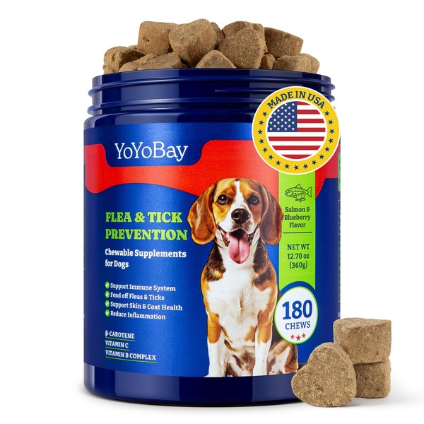 YoYoBay Flea and Tick Prevention for Dogs Chewable - 180 Soft Chews, Salmon & Blueberry Flavor - Dog Flea and Tick Treatment Chewable, Natural Defense- Dog Immune Support Supplement
