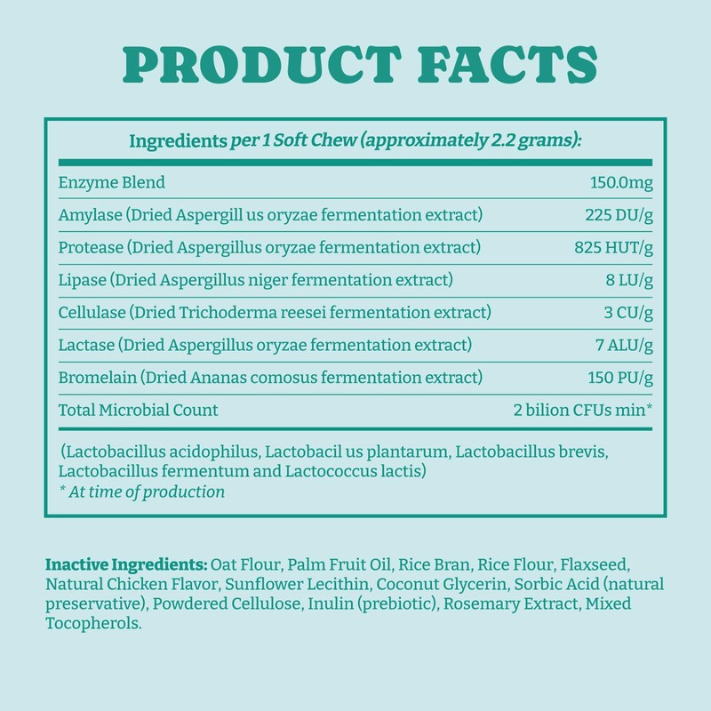 • POTENT ENZYME-PROBIOTIC BLEND C This powerful formula combines 5 key digestive enzymes, including amylase and bromelain, with over 2 billion CFU of Lactobacillus probiotics. Together, they enhance nutrient breakdown and absorption, promote a balanced gut environment, support yeast balance, and improve your dog's overall digestive health.