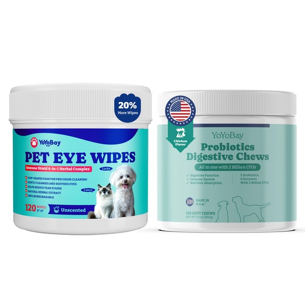 YoYoBay YoYoBay Probiotics for Dogs, Dog Probiotics and Prebiotic with Enzymes, for Gut & Digestive Health and Yeast Balance+YoYoBay Dog Eye Wipes for Tear Stain Remover C 120 Pet Eye Wipes with Herbal Comple