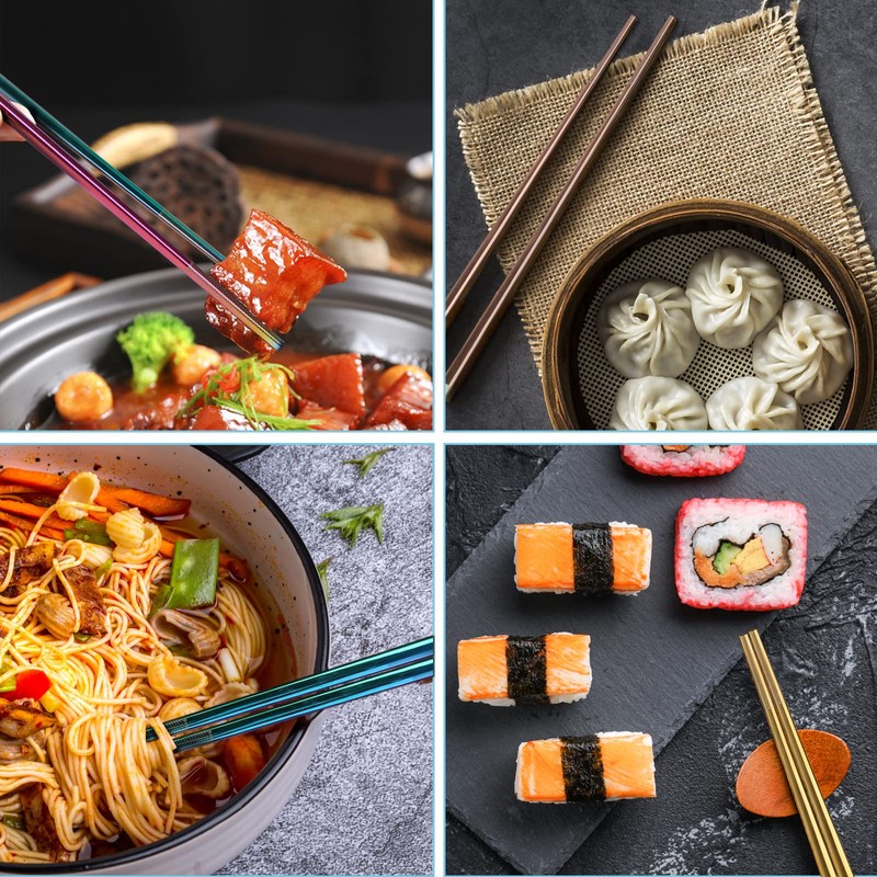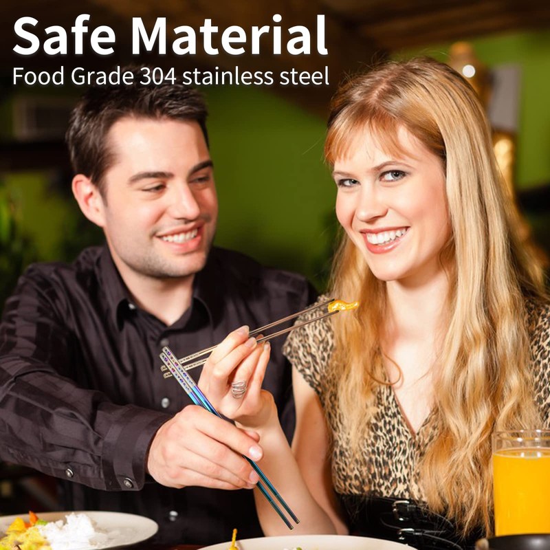 - 【USAGE FEATURES】: Dishwasher safe SUS 304 stainless steel chopsticks are more environmentally friendly than using disposable chopsticks. Great for Japanese, Korean, Chinese food. Whether you are eating sushi, ramen, rice, pasta, Korean BBQ or hosting an Asian style dinner party, it will definitely give you a relaxing and enjoyable experience meal just to use these lightweight and grippy non-slip chopsticks.