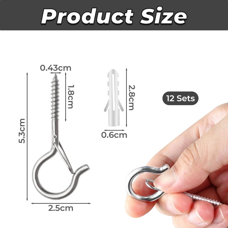 Yphzmtz Pack of 12 Stainless Steel Screw Hooks Heavy Duty (with Dowels & Secure) - Ceiling Hooks/Wall Hooks for Fairy Lights, Plant Baskets, Christmas Decoration, Cat Net