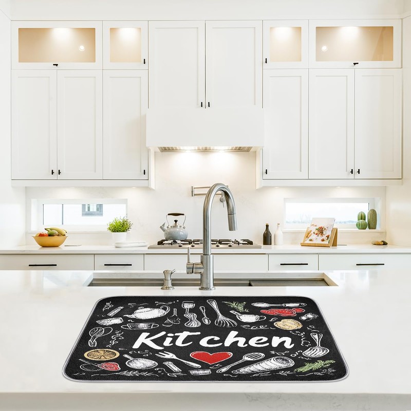 Absorbent Kitchen Drying Mat for Dishes Countertop Protector Mat Dish Drain Mat Reversible and Decorative Coffee Bar MatUpgrade your kitchen with our Absorbent Kitchen Drying Mat, designed to combine functionality and styleProduct Details:Measuring 18x24 inches, this large mat fits most countertops, providing ample space to dry pots, pans, dishes, cups, and bottles. Made from premium microfiber and composite sponge, it quickly absorbs water, keeping your countertops dry and clean.The anti-slip backing ensures the mat stays in place, while its reversible design protects your countertops from scratches and crashes. Use it as a heat-resistant potholder or to safeguard small appliances like blenders and coffee makers.Featuring vibrant, fade-resistant colors and artistic prints, this mat adds a touch of elegance to your kitchen. The convenient lanyard allows for easy hanging storage when not in use.Whether for daily use or as a thoughtful gift for housewarming, Mother's Day, or Christmas, this mat is a versatile and practical addition to any home. Hand wash recommended for long-lasting use.After-Sales Service:For any quality issues, contact us via Amazon email, and we'll resolve your concerns within 24 hours. Enhance your kitchen experience with our premium drying mat today