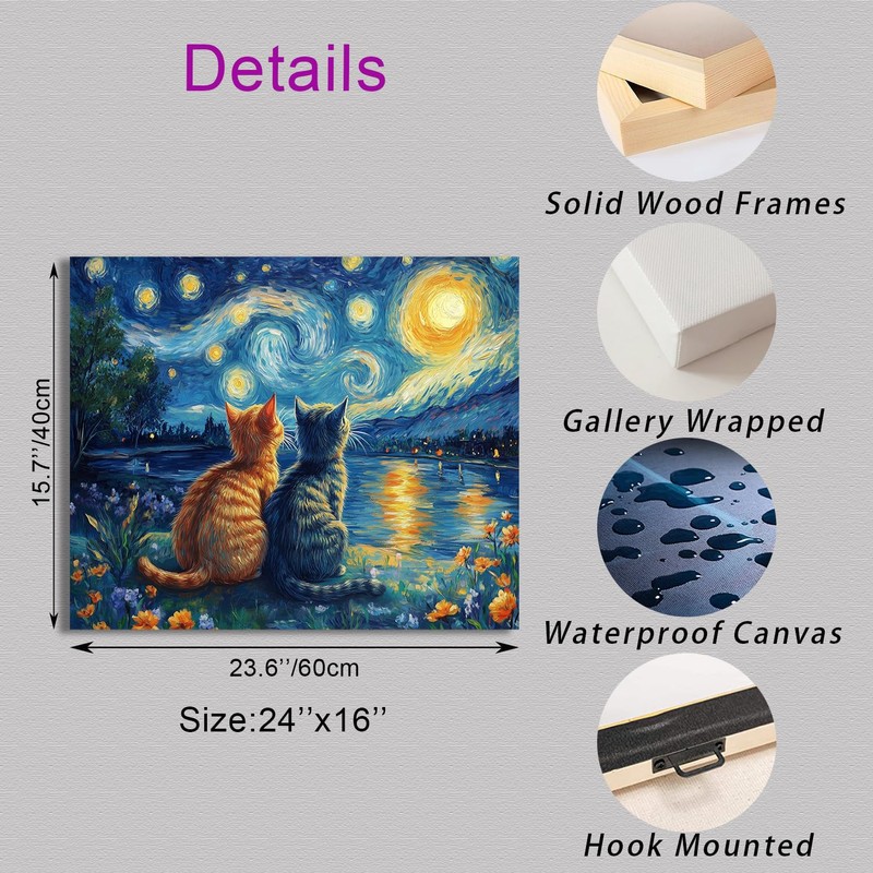 - Artistic Masterpiece: This wall art is a high-quality reproduction of the iconic 'Starry Night' painting by Vincent Van Gogh, featuring two cats admiring the swirling night sky