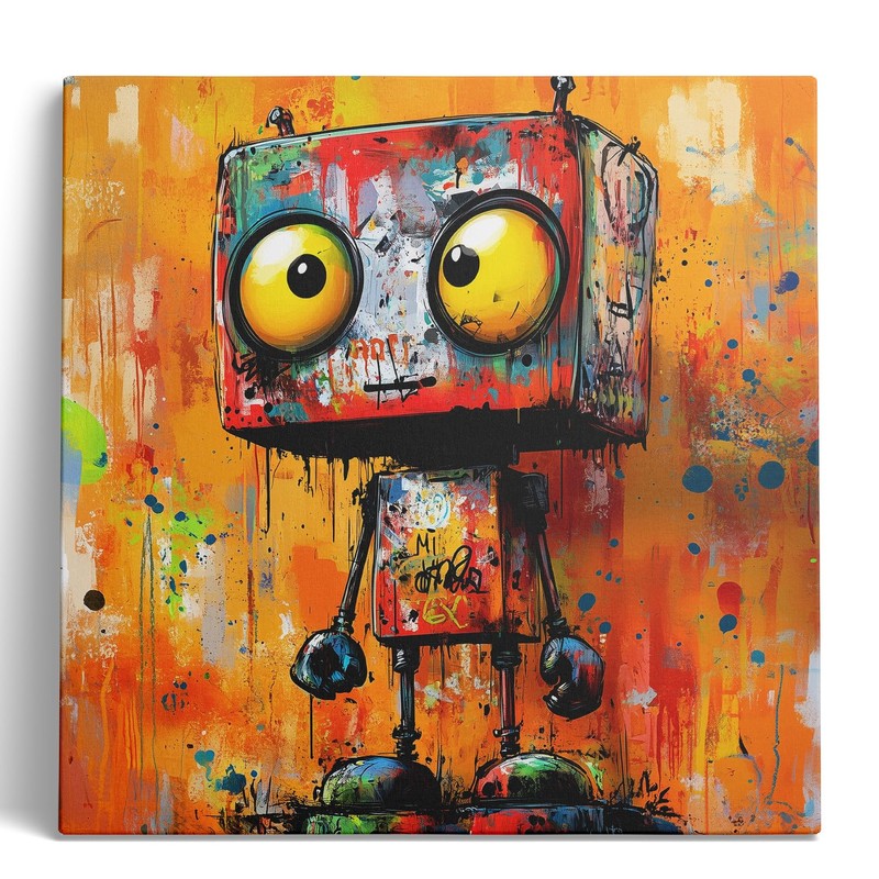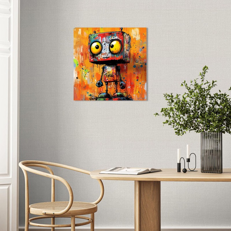 - Vibrant Design: Striking abstract graffiti-style artwork featuring a quirky robot face with yellow eyes on a bright orange background splattered with colorful paint drips.