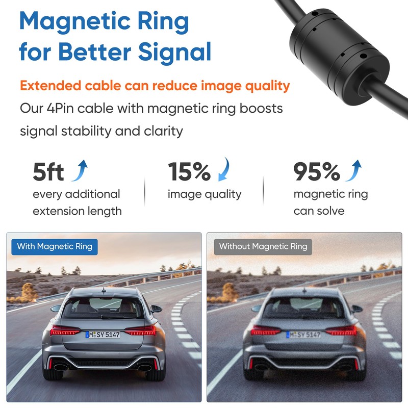 - 【Exclusive Magnetic Ring】 Extending a rearview camera cable can often degrade image quality. Our 4Pin backup camera extension cable is uniquely equipped with a magnetic ring that eliminates 95% of signal interference, ensuring stable signals and significantly enhancing image quality for clear and smooth video.