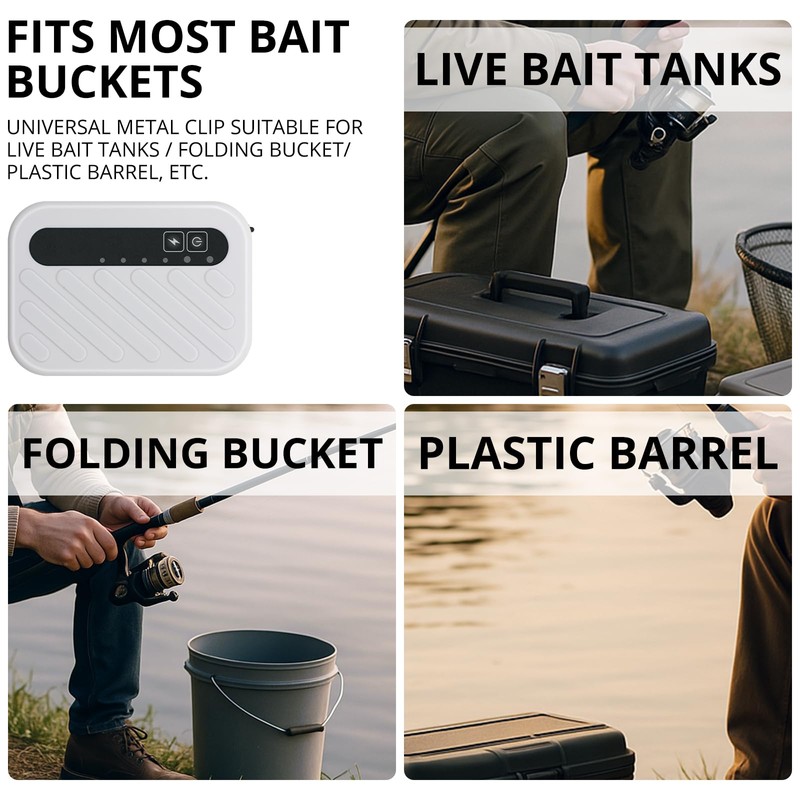 - [Buckle back clip and included content]: Metal suspension buckle for easy clamping on fish tank walls or fishing box walls, including: 1 x Bait Bucket Aerator Pump; 1 x Air Stone; 1 x Rubber Hose; 1 x USB-C Charging cord