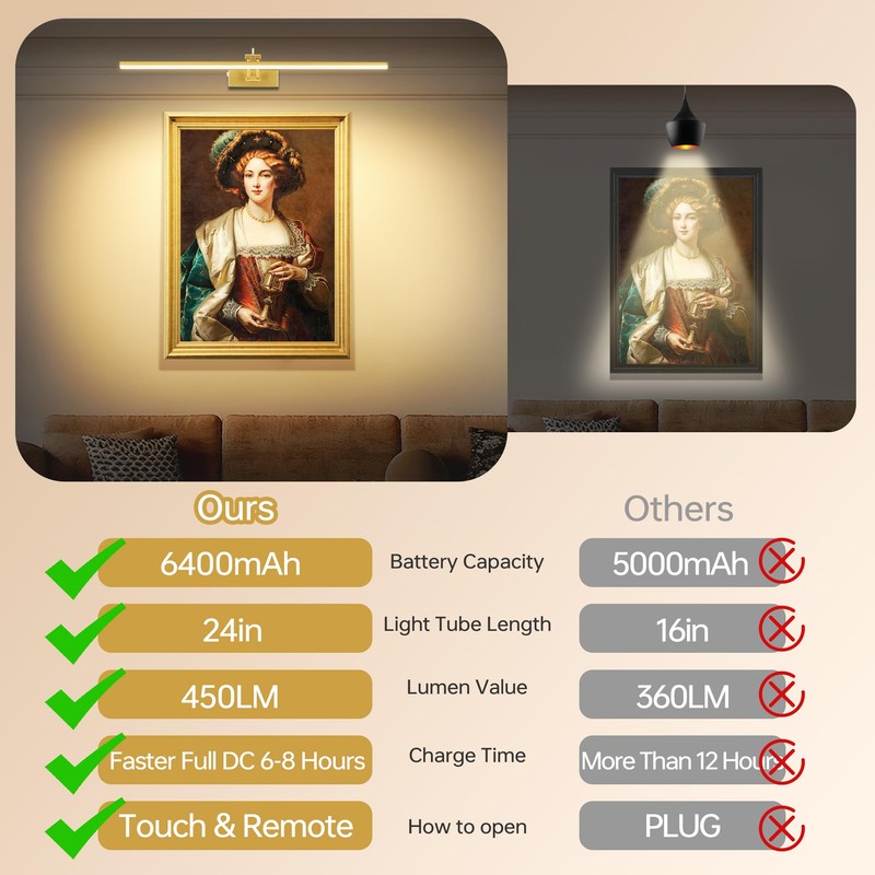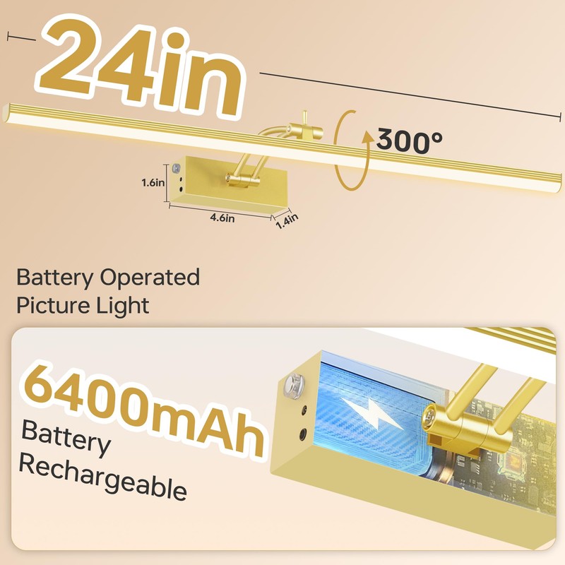 - 6400mAh Rechargeable Picture Light :Longer lasting power for your display. No more hassle of changing batteries—simply detach the LED light bar from the bracket and charge it using the fast USB charging jack. Faster full DC 6-8 hours, it can work for up to 30-48 hours in low-brightness mode and 10-12 hours in high-brightness mode. (USB cable included)