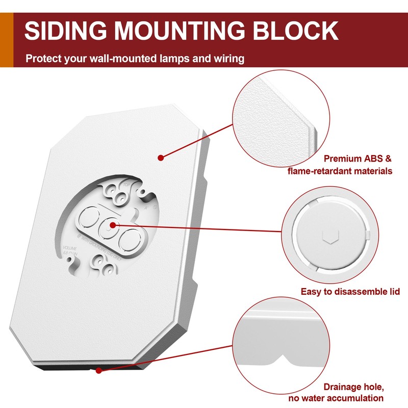 - Size: Siding Mounting Block specially designed for 1/2-inch circle double and 4-inch height lap siding, ensuring seamless waterproof fit. Eliminate the gaps of standard Vinyl Siding Blocks. The Outdoor Mounting Plate kit with Built-in Electrical Box, (suitable for a diameter of 4.11 inches and a depth of 0.6 inches), enhancing the aesthetic appearance of outdoor lighting fixtures.